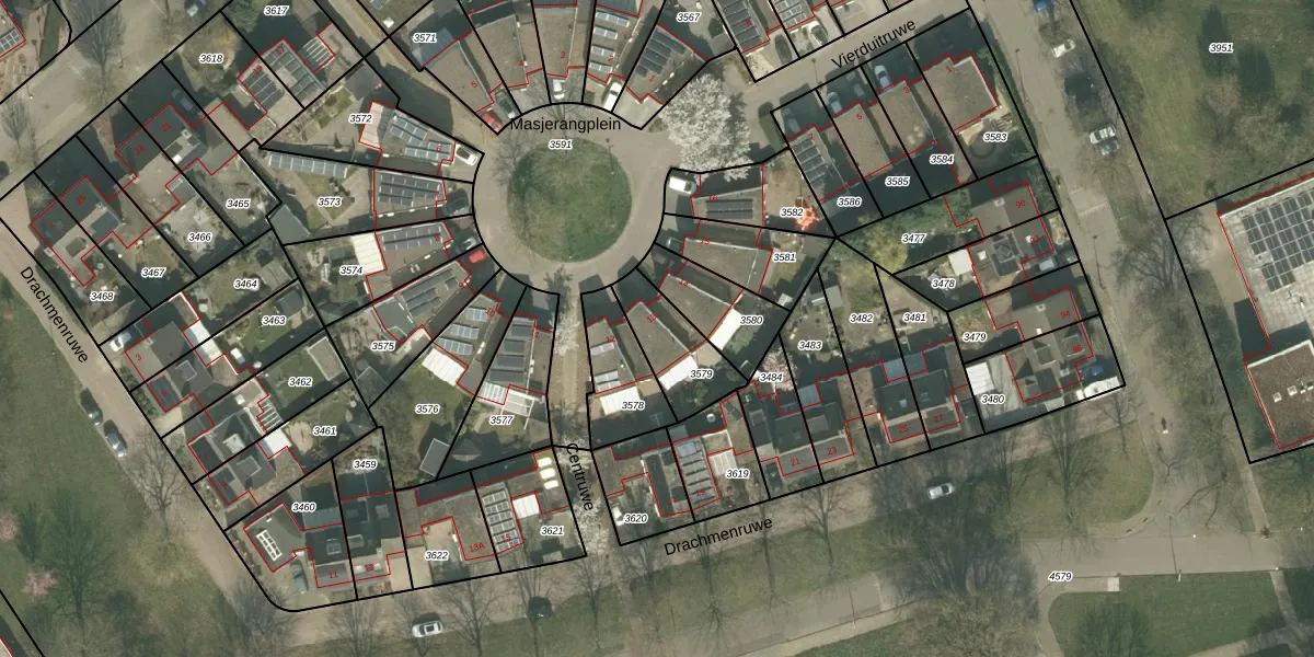 Het perceel waarop Masjerangplein 13 staat heeft een oppervlakte van 202 m². Dit is een middelgroot perceel. De perceeloppervlakte wordt geregistreerd door het Kadaster. Gedetailleerde informatie over de maten van dit perceel kunt u vinden in het rapport Kadastrale kaart met maatvoering van Masjerangplein 13.