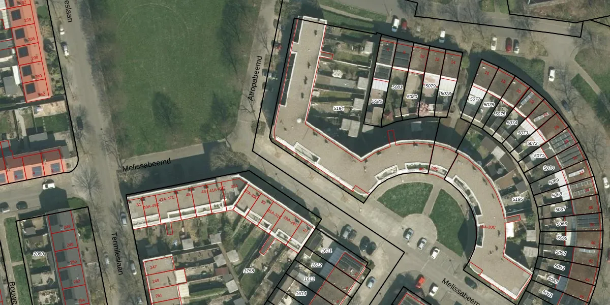 Het perceel waarop Melissabeemd 56 staat heeft een oppervlakte van 1870 m². Dit is een zeer groot perceel. De perceeloppervlakte wordt geregistreerd door het Kadaster. Gedetailleerde informatie over de maten van dit perceel kunt u vinden in het rapport Kadastrale kaart met maatvoering van Melissabeemd 56.