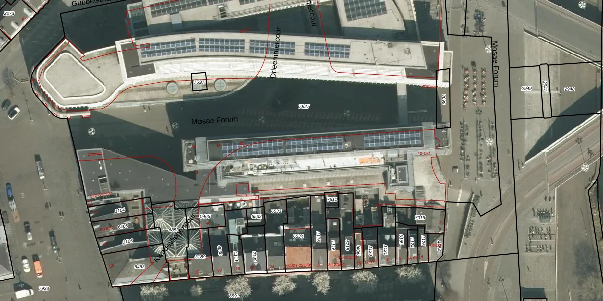 Het perceel waarop Mosae Forum 24 staat heeft een oppervlakte van 1,1 ha. Dit is een zeer groot perceel. De perceeloppervlakte wordt geregistreerd door het Kadaster. Gedetailleerde informatie over de maten van dit perceel kunt u vinden in het rapport Kadastrale kaart met maatvoering van Mosae Forum 24.