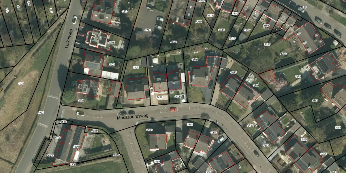 Mosasaurusweg 13 is gelegen op kadastraal perceel PTR00B3500. Deze kadastrale aanduiding is uniek en wordt gebruikt door het Kadaster om eigendomsrechten en andere zakelijke rechten vast te leggen. Het perceel maakt onderdeel uit van de kadastrale gemeente Sint Pieter.