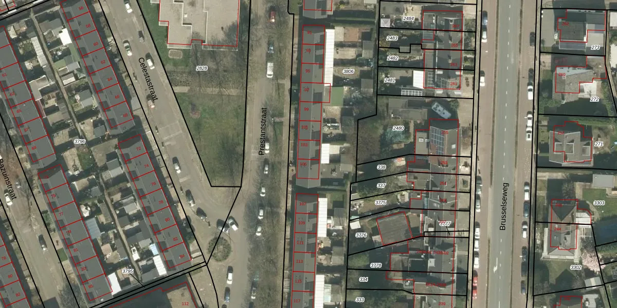 Het perceel waarop Prestantstraat 103 staat heeft een oppervlakte van 3645 m². Dit is een zeer groot perceel. De perceeloppervlakte wordt geregistreerd door het Kadaster. Gedetailleerde informatie over de maten van dit perceel kunt u vinden in het rapport Kadastrale kaart met maatvoering van Prestantstraat 103.