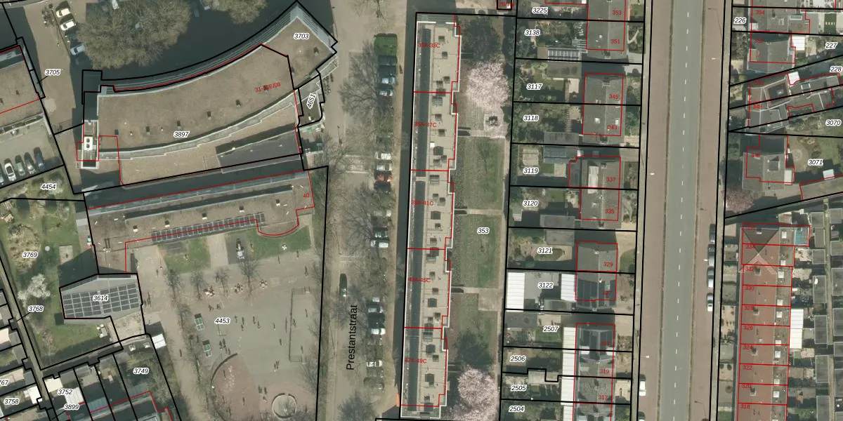 Het perceel waarop Prestantstraat 39-C staat heeft een oppervlakte van 2300 m². Dit is een zeer groot perceel. De perceeloppervlakte wordt geregistreerd door het Kadaster. Gedetailleerde informatie over de maten van dit perceel kunt u vinden in het rapport Kadastrale kaart met maatvoering van Prestantstraat 39-C.