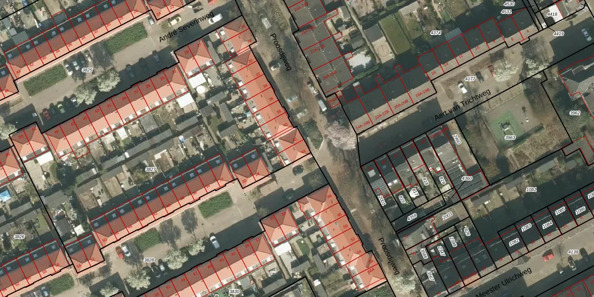 Het perceel waarop Proosdijweg 44 staat heeft een oppervlakte van 4121 m². Dit is een zeer groot perceel. De perceeloppervlakte wordt geregistreerd door het Kadaster. Gedetailleerde informatie over de maten van dit perceel kunt u vinden in het rapport Kadastrale kaart met maatvoering van Proosdijweg 44.
