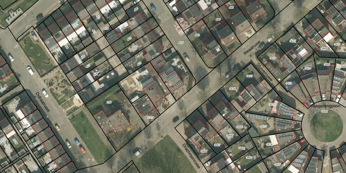 Het perceel waarop Reaalruwe 52 staat heeft een oppervlakte van 421 m². Dit is een groot perceel. De perceeloppervlakte wordt geregistreerd door het Kadaster. Gedetailleerde informatie over de maten van dit perceel kunt u vinden in het rapport Kadastrale kaart met maatvoering van Reaalruwe 52.