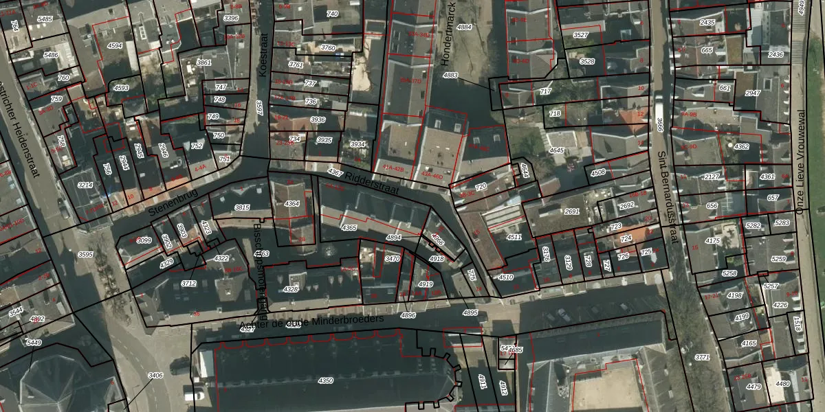 Ridderstraat 12-B is gelegen op kadastraal perceel MTT00B4365. Deze kadastrale aanduiding is uniek en wordt gebruikt door het Kadaster om eigendomsrechten en andere zakelijke rechten vast te leggen. Het perceel maakt onderdeel uit van de kadastrale gemeente Maastricht.