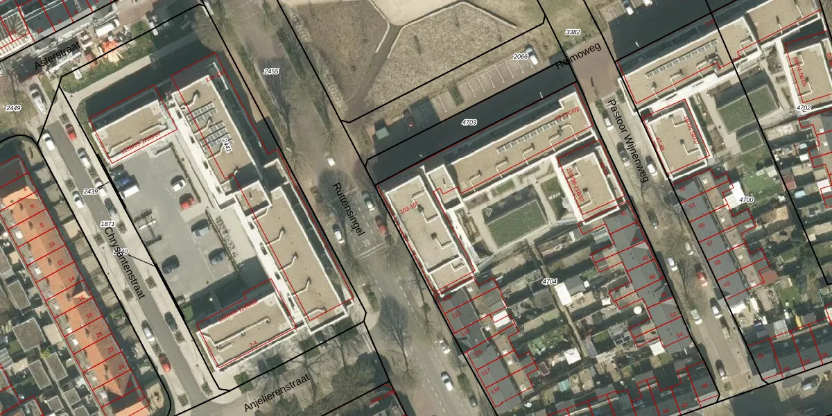 Het perceel waarop Ruttensingel 103 staat heeft een oppervlakte van 4245 m². Dit is een zeer groot perceel. De perceeloppervlakte wordt geregistreerd door het Kadaster. Gedetailleerde informatie over de maten van dit perceel kunt u vinden in het rapport Kadastrale kaart met maatvoering van Ruttensingel 103.