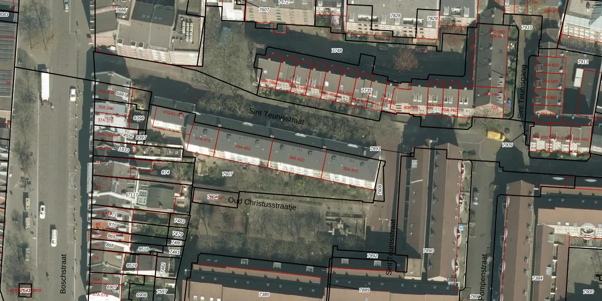 Het perceel waarop Sint Teunisstraat 39-C staat heeft een oppervlakte van 1317 m². Dit is een zeer groot perceel. De perceeloppervlakte wordt geregistreerd door het Kadaster. Gedetailleerde informatie over de maten van dit perceel kunt u vinden in het rapport Kadastrale kaart met maatvoering van Sint Teunisstraat 39-C.