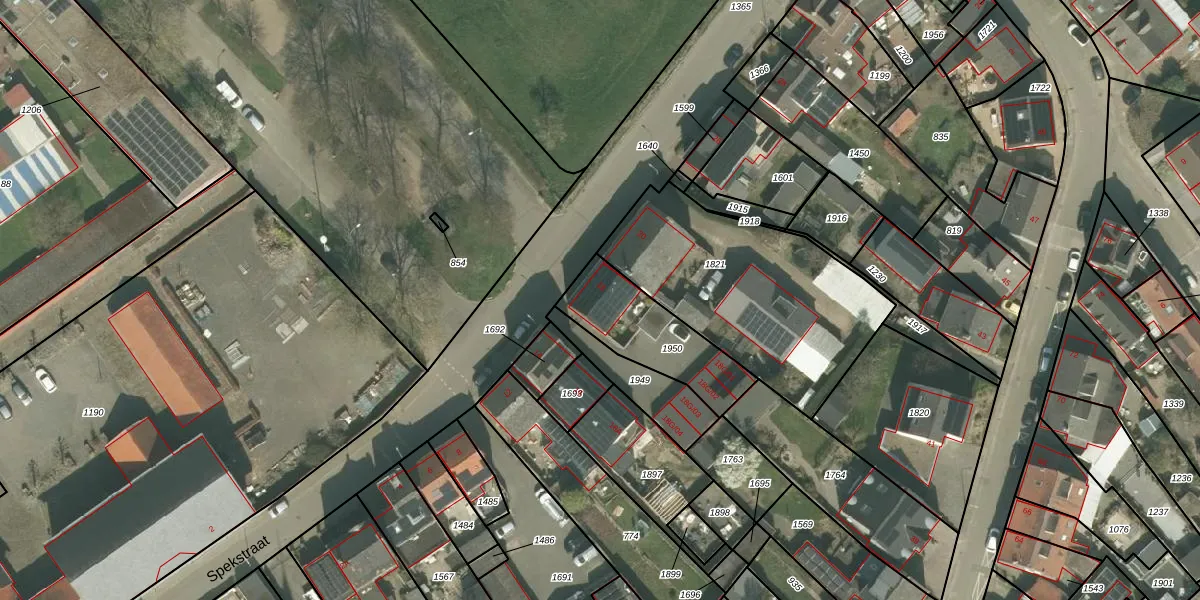 Het perceel waarop Spekstraat 18 staat heeft een oppervlakte van 347 m². Dit is een groot perceel. De perceeloppervlakte wordt geregistreerd door het Kadaster. Gedetailleerde informatie over de maten van dit perceel kunt u vinden in het rapport Kadastrale kaart met maatvoering van Spekstraat 18.