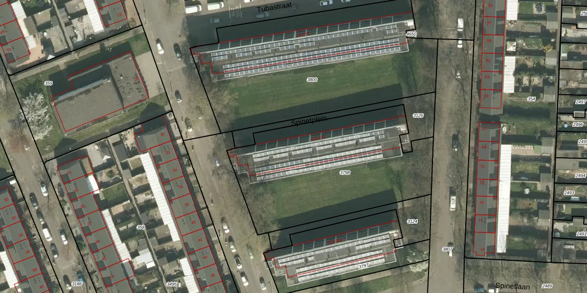 Het perceel waarop Spinetplein 25-A staat heeft een oppervlakte van 2027 m². Dit is een zeer groot perceel. De perceeloppervlakte wordt geregistreerd door het Kadaster. Gedetailleerde informatie over de maten van dit perceel kunt u vinden in het rapport Kadastrale kaart met maatvoering van Spinetplein 25-A.
