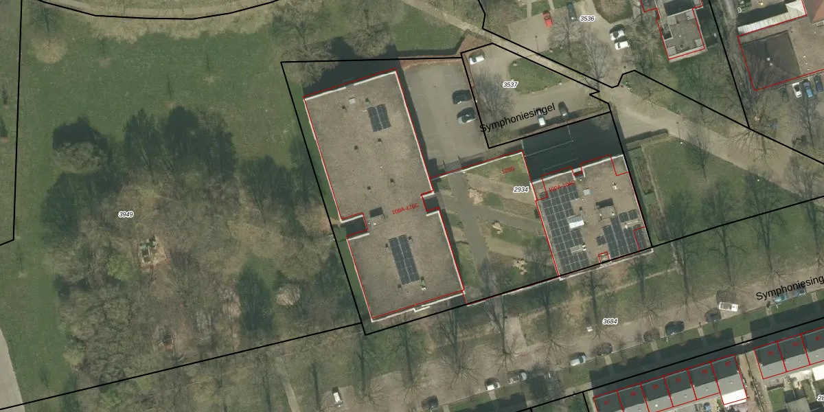 Het perceel waarop Symphoniesingel 112-A staat heeft een oppervlakte van 3772 m². Dit is een zeer groot perceel. De perceeloppervlakte wordt geregistreerd door het Kadaster. Gedetailleerde informatie over de maten van dit perceel kunt u vinden in het rapport Kadastrale kaart met maatvoering van Symphoniesingel 112-A.