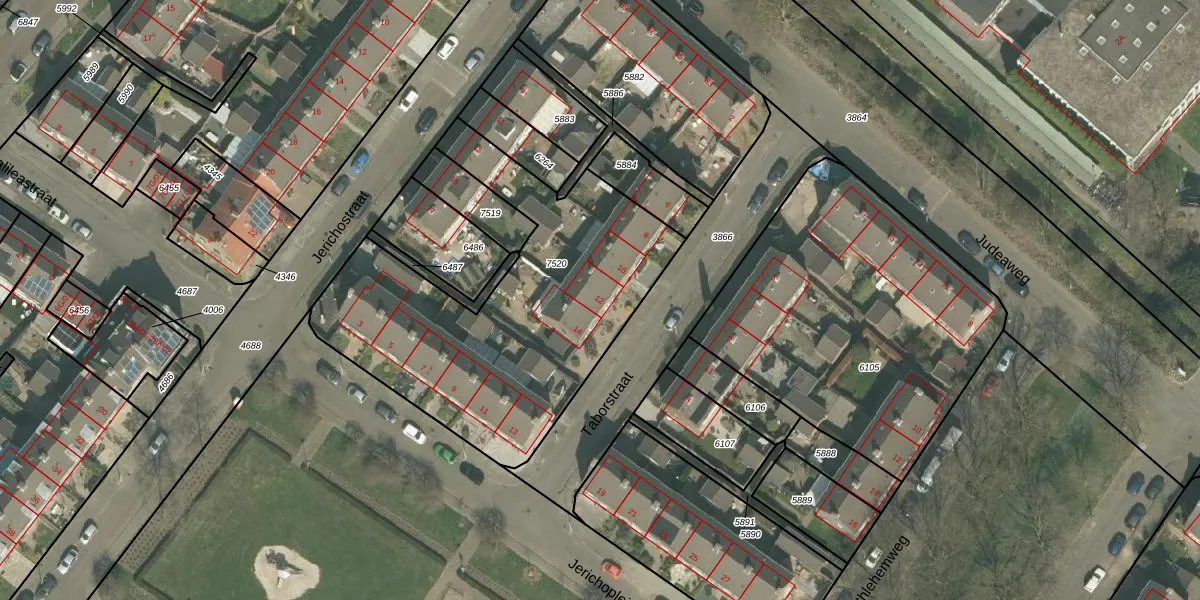 Het perceel waarop Taborstraat 12 staat heeft een oppervlakte van 1582 m². Dit is een zeer groot perceel. De perceeloppervlakte wordt geregistreerd door het Kadaster. Gedetailleerde informatie over de maten van dit perceel kunt u vinden in het rapport Kadastrale kaart met maatvoering van Taborstraat 12.