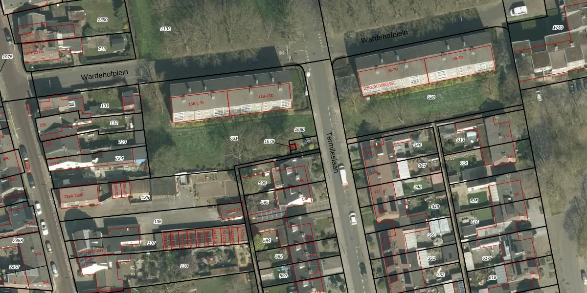 Het perceel waarop Termileslaan 104-TR staat heeft een oppervlakte van 3 m². Dit is een klein perceel. De perceeloppervlakte wordt geregistreerd door het Kadaster. Gedetailleerde informatie over de maten van dit perceel kunt u vinden in het rapport Kadastrale kaart met maatvoering van Termileslaan 104-TR.