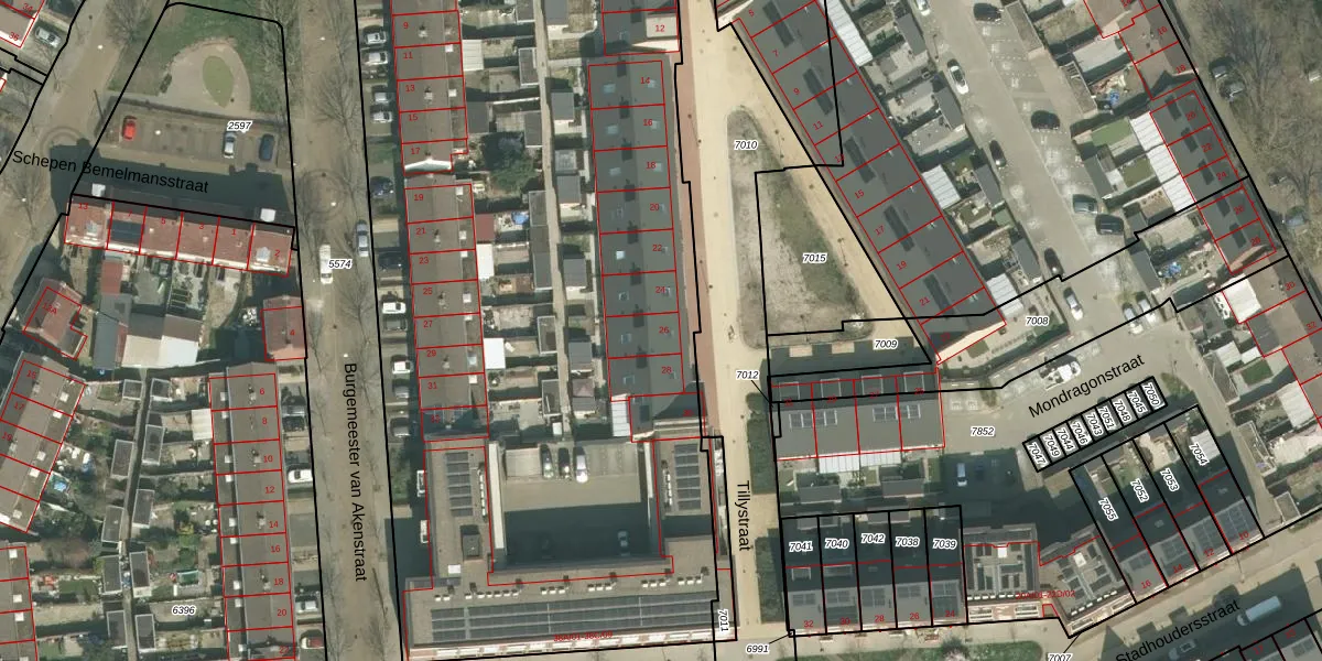 Het perceel waarop Tillystraat 26 staat heeft een oppervlakte van 6598 m². Dit is een zeer groot perceel. De perceeloppervlakte wordt geregistreerd door het Kadaster. Gedetailleerde informatie over de maten van dit perceel kunt u vinden in het rapport Kadastrale kaart met maatvoering van Tillystraat 26.