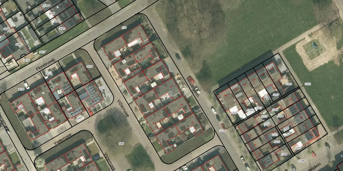 Het perceel waarop Vendelplein 27 staat heeft een oppervlakte van 2995 m². Dit is een zeer groot perceel. De perceeloppervlakte wordt geregistreerd door het Kadaster. Gedetailleerde informatie over de maten van dit perceel kunt u vinden in het rapport Kadastrale kaart met maatvoering van Vendelplein 27.