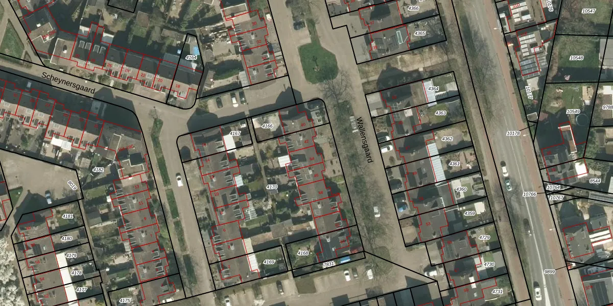 Het perceel waarop Wallensgaard 44 staat heeft een oppervlakte van 1755 m². Dit is een zeer groot perceel. De perceeloppervlakte wordt geregistreerd door het Kadaster. Gedetailleerde informatie over de maten van dit perceel kunt u vinden in het rapport Kadastrale kaart met maatvoering van Wallensgaard 44.
