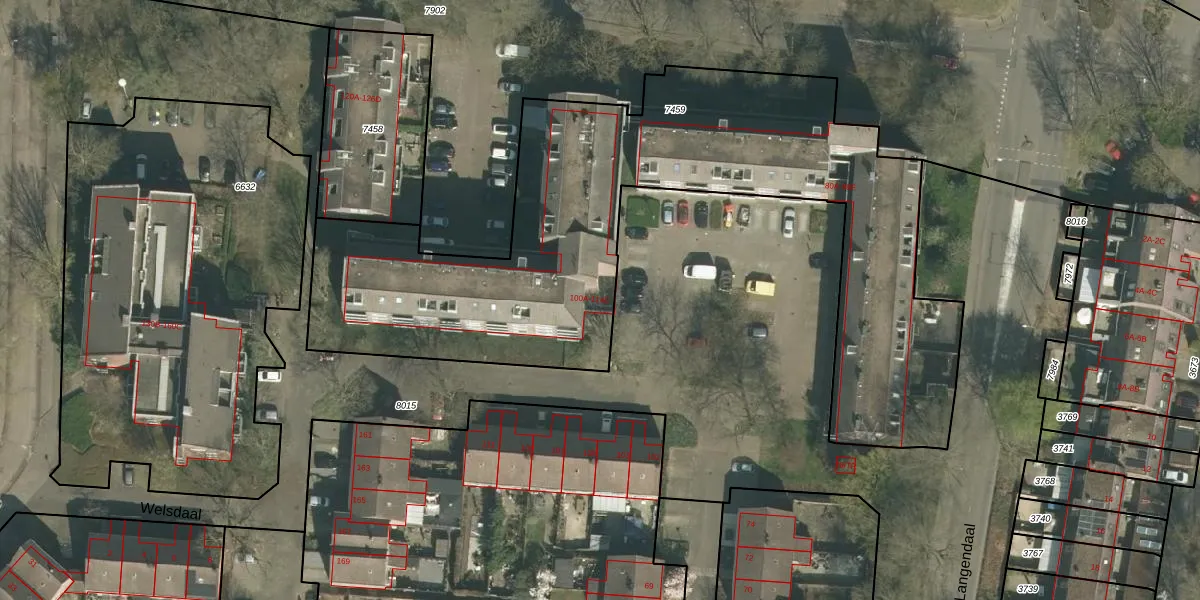 Welsdaal 100-E is gelegen op kadastraal perceel MTT00P7459. Deze kadastrale aanduiding is uniek en wordt gebruikt door het Kadaster om eigendomsrechten en andere zakelijke rechten vast te leggen. Het perceel maakt onderdeel uit van de kadastrale gemeente Maastricht.