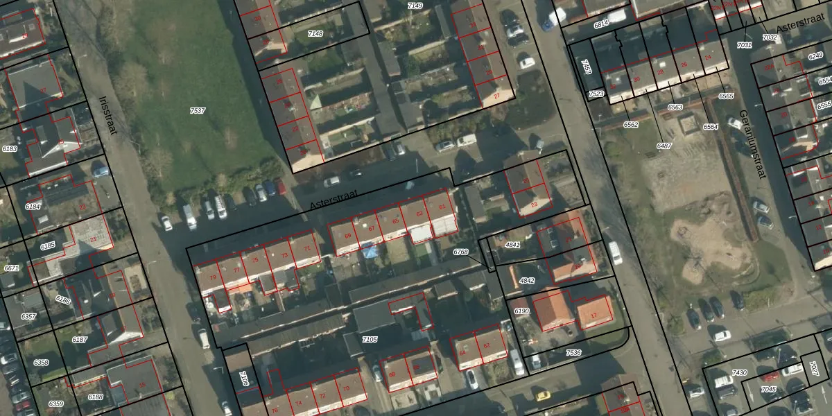 Het perceel waarop Asterstraat 63 staat heeft een oppervlakte van 3872 m². Dit is een zeer groot perceel. De perceeloppervlakte wordt geregistreerd door het Kadaster. Gedetailleerde informatie over de maten van dit perceel kunt u vinden in het rapport Kadastrale kaart met maatvoering van Asterstraat 63.