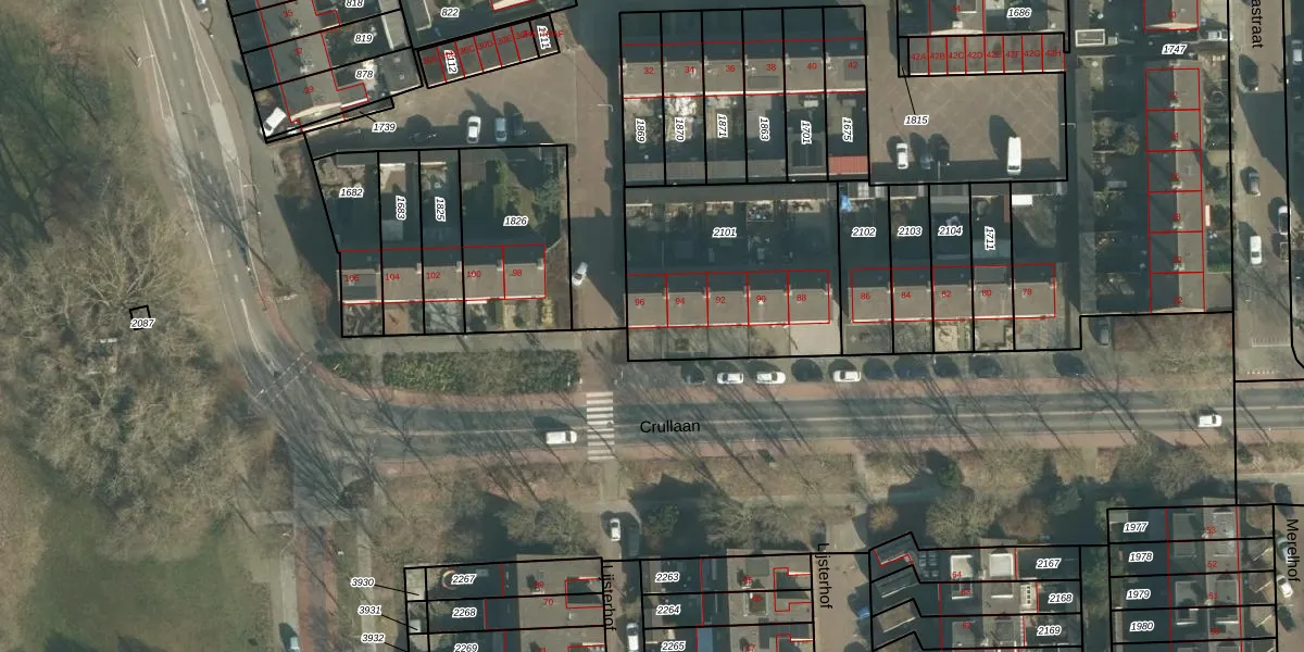 Het perceel waarop Crullaan 96 staat heeft een oppervlakte van 883 m². Dit is een groot perceel. De perceeloppervlakte wordt geregistreerd door het Kadaster. Gedetailleerde informatie over de maten van dit perceel kunt u vinden in het rapport Kadastrale kaart met maatvoering van Crullaan 96.