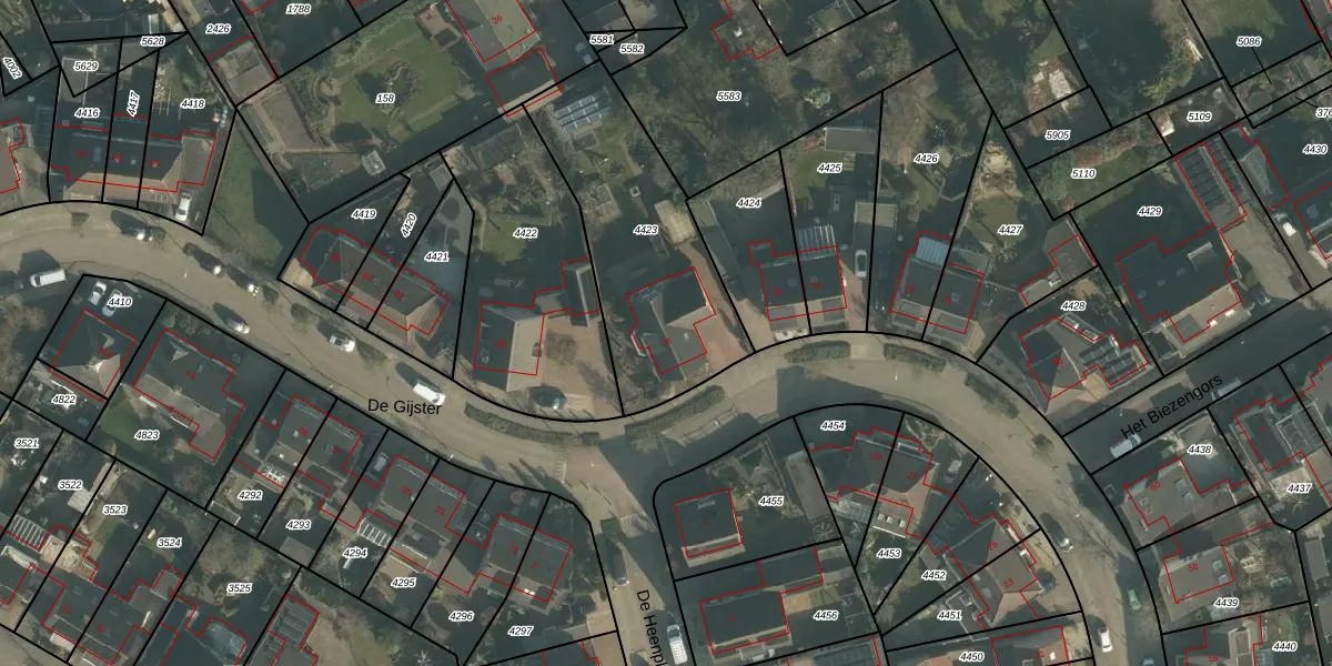 Het perceel waarop De Gijster 78 staat heeft een oppervlakte van 831 m². Dit is een groot perceel. De perceeloppervlakte wordt geregistreerd door het Kadaster. Gedetailleerde informatie over de maten van dit perceel kunt u vinden in het rapport Kadastrale kaart met maatvoering van De Gijster 78.