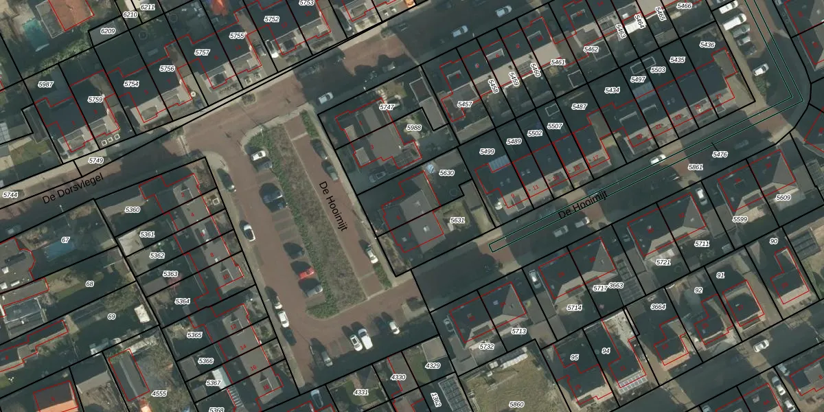 De Hooimijt 5 is gelegen op kadastraal perceel MDE01S5630. Deze kadastrale aanduiding is uniek en wordt gebruikt door het Kadaster om eigendomsrechten en andere zakelijke rechten vast te leggen. Het perceel maakt onderdeel uit van de kadastrale gemeente Made en Drimmelen.