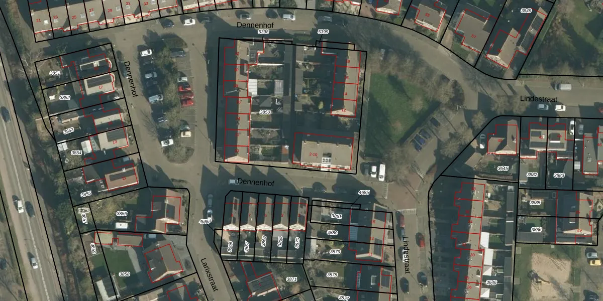 Het perceel waarop Dennenhof 2 staat heeft een oppervlakte van 1968 m². Dit is een zeer groot perceel. De perceeloppervlakte wordt geregistreerd door het Kadaster. Gedetailleerde informatie over de maten van dit perceel kunt u vinden in het rapport Kadastrale kaart met maatvoering van Dennenhof 2.