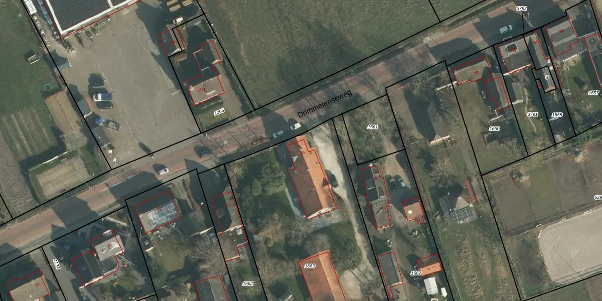 Het perceel waarop Drimmelenseweg 26 staat heeft een oppervlakte van 7335 m². Dit is een zeer groot perceel. De perceeloppervlakte wordt geregistreerd door het Kadaster. Gedetailleerde informatie over de maten van dit perceel kunt u vinden in het rapport Kadastrale kaart met maatvoering van Drimmelenseweg 26.