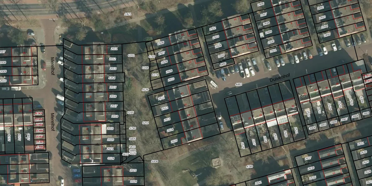 Het perceel waarop Duivenhof 21 staat heeft een oppervlakte van 196 m². Dit is een middelgroot perceel. De perceeloppervlakte wordt geregistreerd door het Kadaster. Gedetailleerde informatie over de maten van dit perceel kunt u vinden in het rapport Kadastrale kaart met maatvoering van Duivenhof 21.