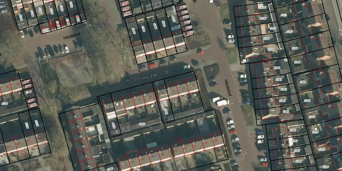 Het perceel waarop Heidehof 12 staat heeft een oppervlakte van 3907 m². Dit is een zeer groot perceel. De perceeloppervlakte wordt geregistreerd door het Kadaster. Gedetailleerde informatie over de maten van dit perceel kunt u vinden in het rapport Kadastrale kaart met maatvoering van Heidehof 12.