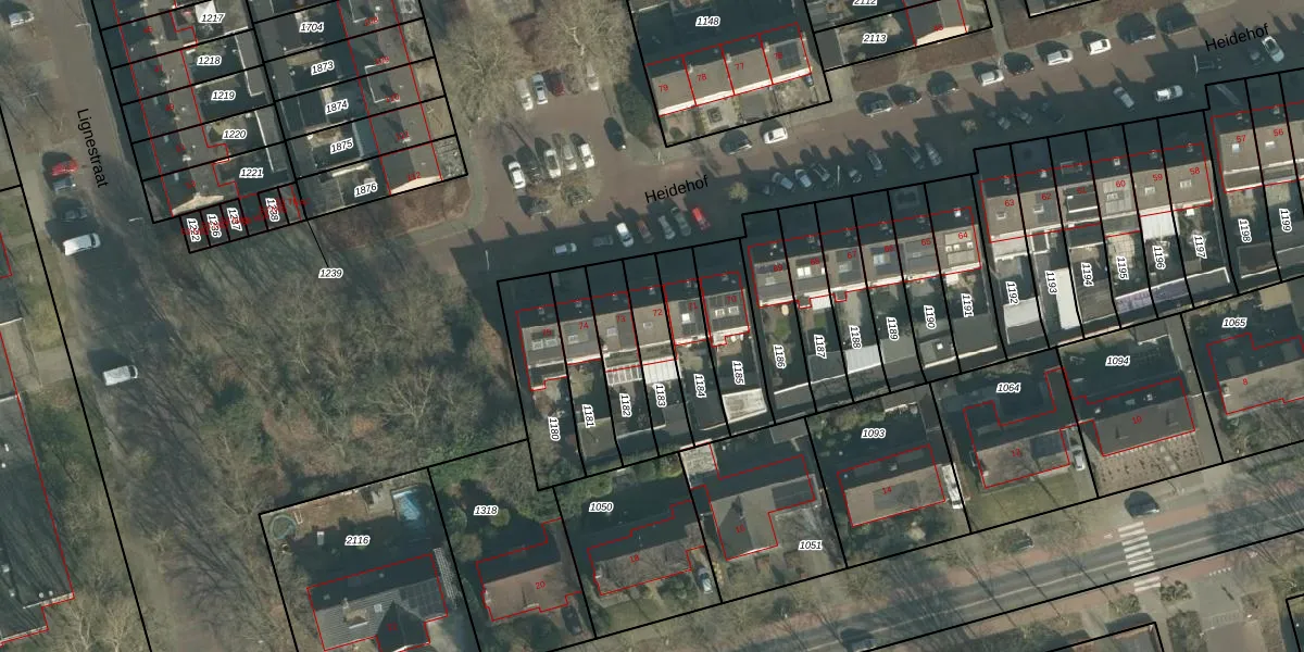 Het perceel waarop Heidehof 72 staat heeft een oppervlakte van 174 m². Dit is een middelgroot perceel. De perceeloppervlakte wordt geregistreerd door het Kadaster. Gedetailleerde informatie over de maten van dit perceel kunt u vinden in het rapport Kadastrale kaart met maatvoering van Heidehof 72.