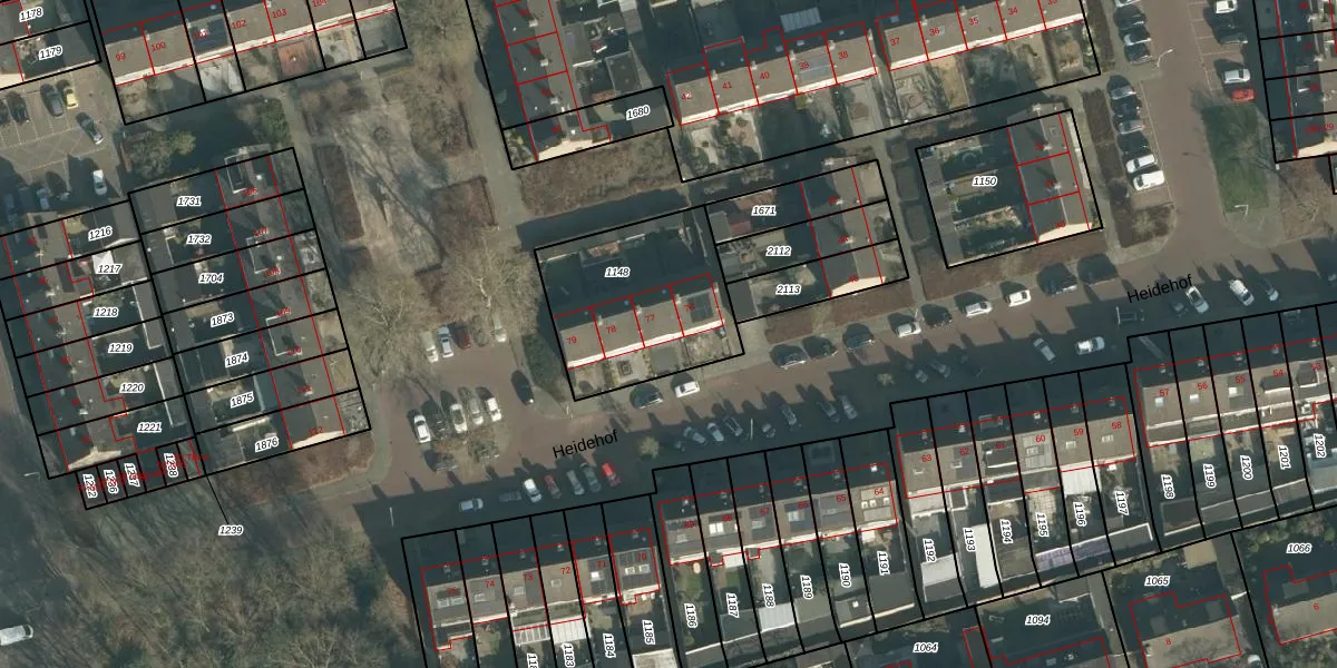Het perceel waarop Heidehof 77 staat heeft een oppervlakte van 612 m². Dit is een groot perceel. De perceeloppervlakte wordt geregistreerd door het Kadaster. Gedetailleerde informatie over de maten van dit perceel kunt u vinden in het rapport Kadastrale kaart met maatvoering van Heidehof 77.