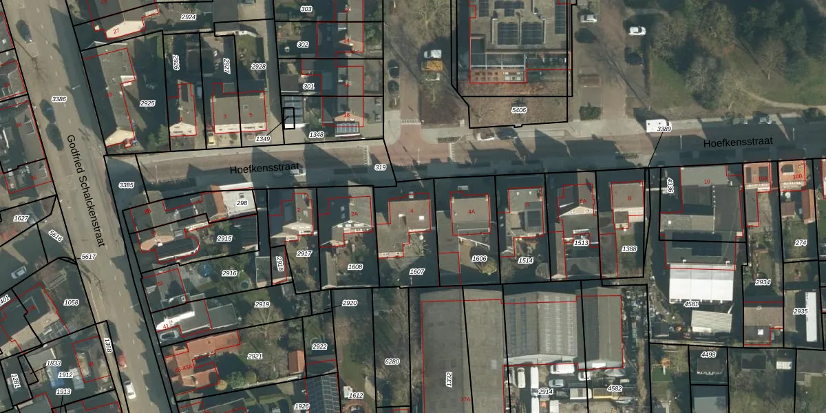 Het perceel waarop Hoefkensstraat 4 staat heeft een oppervlakte van 370 m². Dit is een groot perceel. De perceeloppervlakte wordt geregistreerd door het Kadaster. Gedetailleerde informatie over de maten van dit perceel kunt u vinden in het rapport Kadastrale kaart met maatvoering van Hoefkensstraat 4.