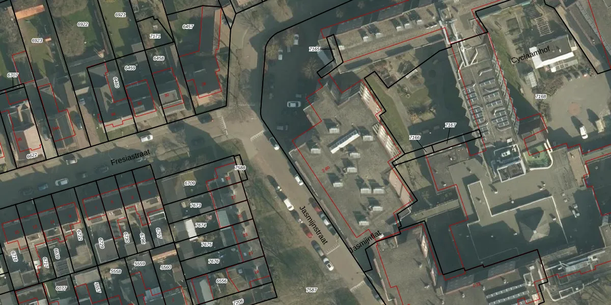 Het perceel waarop Jasmijnflat 20 staat heeft een oppervlakte van 5560 m². Dit is een zeer groot perceel. De perceeloppervlakte wordt geregistreerd door het Kadaster. Gedetailleerde informatie over de maten van dit perceel kunt u vinden in het rapport Kadastrale kaart met maatvoering van Jasmijnflat 20.