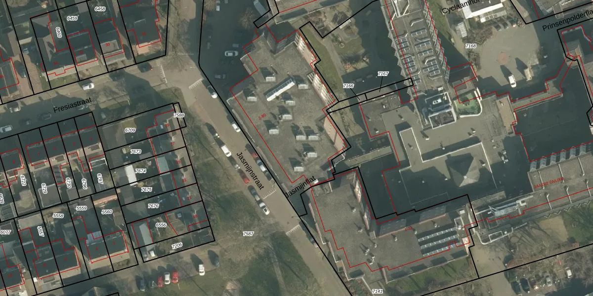 Het perceel waarop Jasmijnflat 26 staat heeft een oppervlakte van 5560 m². Dit is een zeer groot perceel. De perceeloppervlakte wordt geregistreerd door het Kadaster. Gedetailleerde informatie over de maten van dit perceel kunt u vinden in het rapport Kadastrale kaart met maatvoering van Jasmijnflat 26.
