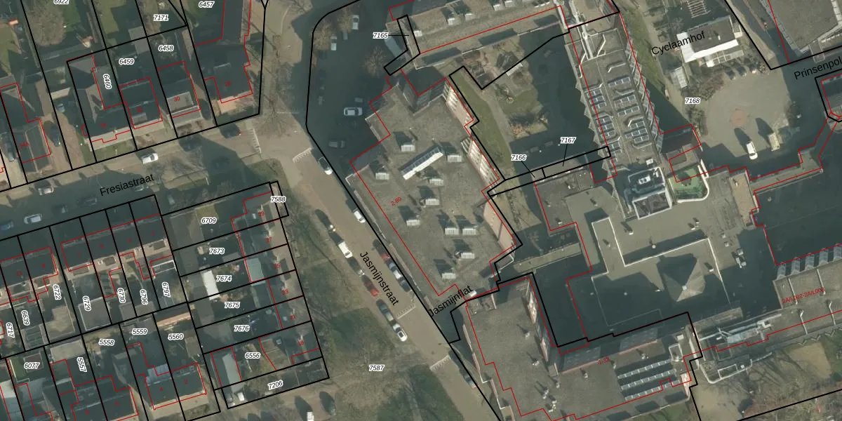 Het perceel waarop Jasmijnflat 32 staat heeft een oppervlakte van 5560 m². Dit is een zeer groot perceel. De perceeloppervlakte wordt geregistreerd door het Kadaster. Gedetailleerde informatie over de maten van dit perceel kunt u vinden in het rapport Kadastrale kaart met maatvoering van Jasmijnflat 32.