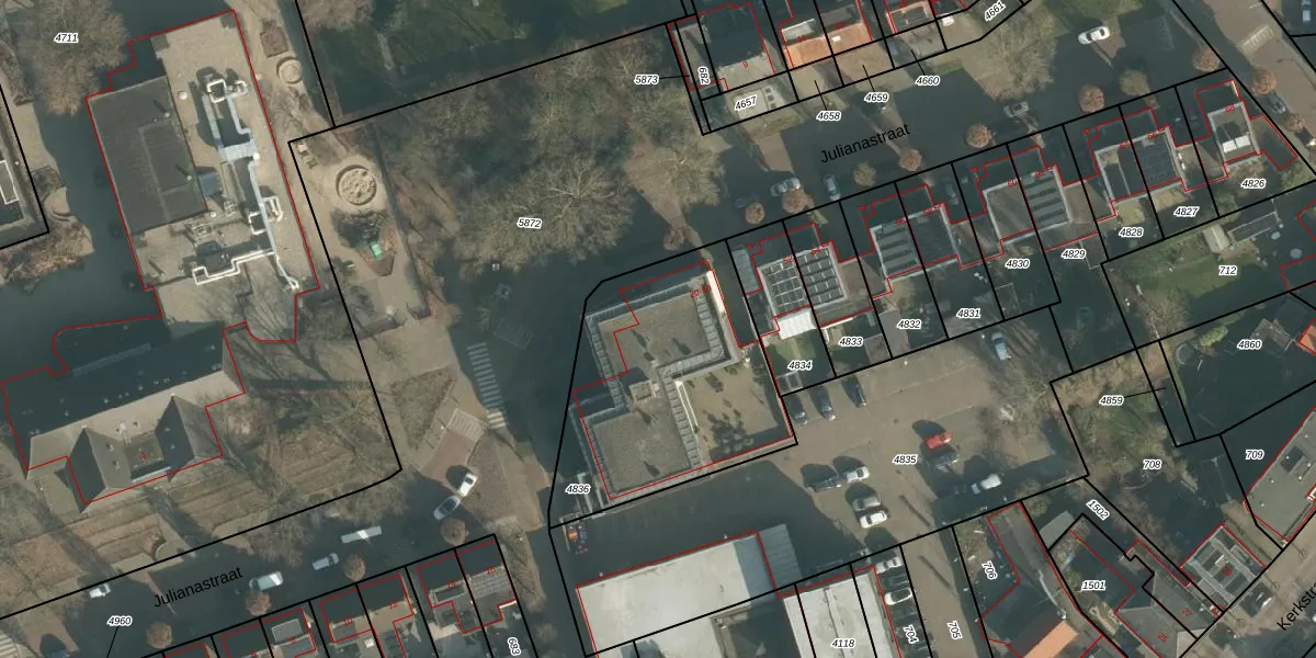 Julianastraat 26 is gelegen op kadastraal perceel MDE01S4836. Deze kadastrale aanduiding is uniek en wordt gebruikt door het Kadaster om eigendomsrechten en andere zakelijke rechten vast te leggen. Het perceel maakt onderdeel uit van de kadastrale gemeente Made en Drimmelen.