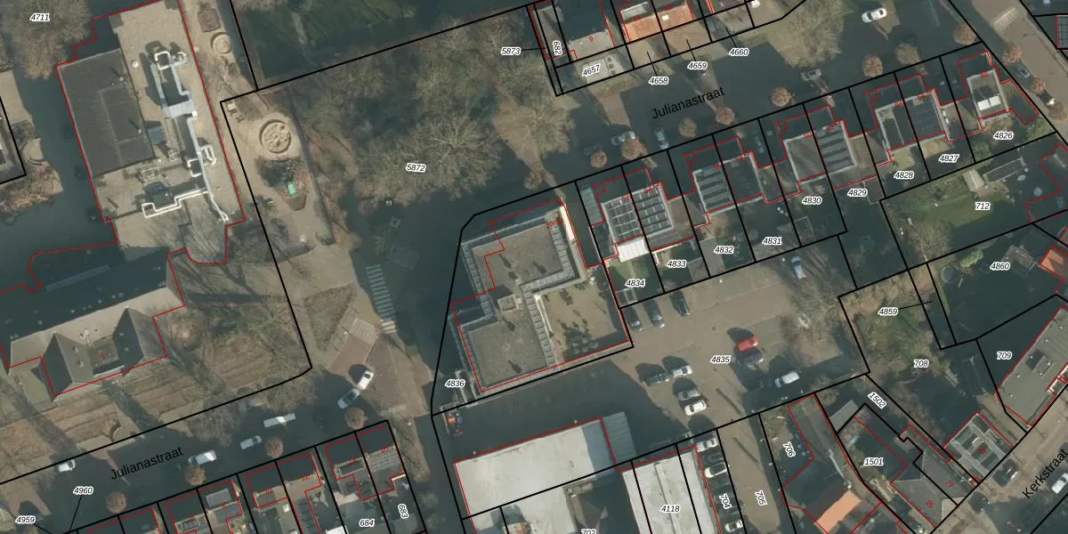 Julianastraat 30 is gelegen op kadastraal perceel MDE01S4836. Deze kadastrale aanduiding is uniek en wordt gebruikt door het Kadaster om eigendomsrechten en andere zakelijke rechten vast te leggen. Het perceel maakt onderdeel uit van de kadastrale gemeente Made en Drimmelen.
