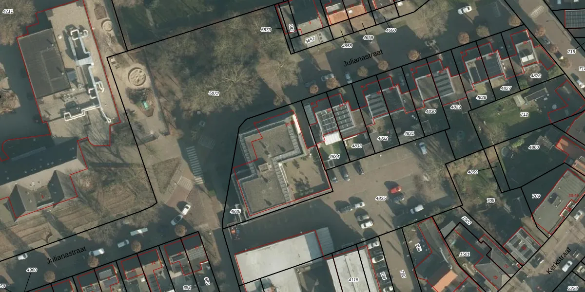 Julianastraat 32 is gelegen op kadastraal perceel MDE01S4836. Deze kadastrale aanduiding is uniek en wordt gebruikt door het Kadaster om eigendomsrechten en andere zakelijke rechten vast te leggen. Het perceel maakt onderdeel uit van de kadastrale gemeente Made en Drimmelen.