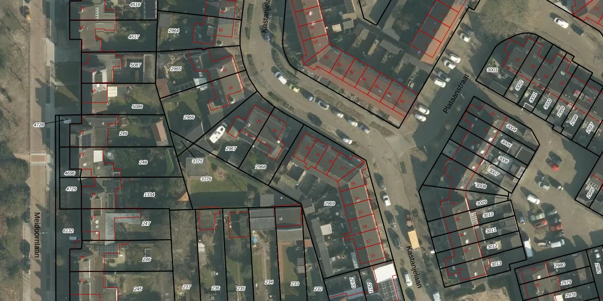 Kastanjelaan 33 is gelegen op kadastraal perceel MDE01S2969. Deze kadastrale aanduiding is uniek en wordt gebruikt door het Kadaster om eigendomsrechten en andere zakelijke rechten vast te leggen. Het perceel maakt onderdeel uit van de kadastrale gemeente Made en Drimmelen.