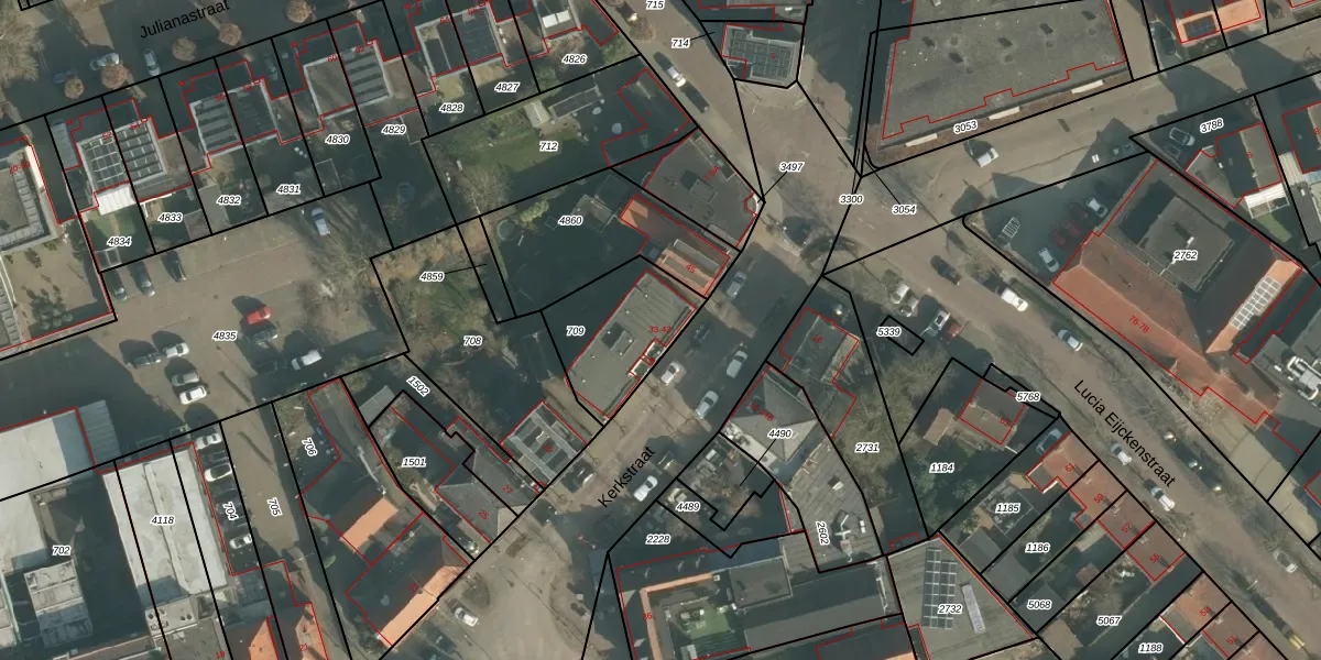 Kerkstraat 33 is gelegen op kadastraal perceel MDE01S709. Deze kadastrale aanduiding is uniek en wordt gebruikt door het Kadaster om eigendomsrechten en andere zakelijke rechten vast te leggen. Het perceel maakt onderdeel uit van de kadastrale gemeente Made en Drimmelen.