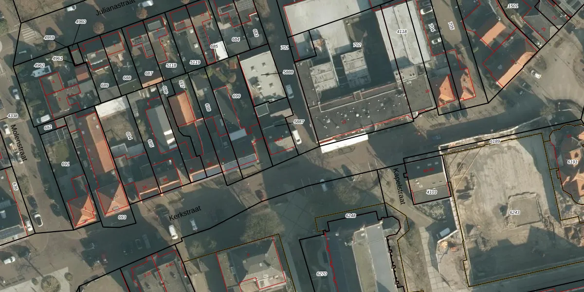 Kerkstraat 9-A is gelegen op kadastraal perceel MDE01S5887. Deze kadastrale aanduiding is uniek en wordt gebruikt door het Kadaster om eigendomsrechten en andere zakelijke rechten vast te leggen. Het perceel maakt onderdeel uit van de kadastrale gemeente Made en Drimmelen.