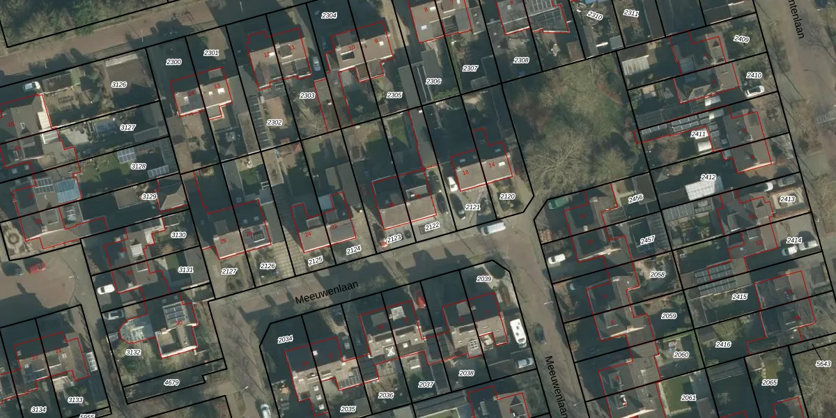 Het perceel waarop Meeuwenlaan 18 staat heeft een oppervlakte van 310 m². Dit is een groot perceel. De perceeloppervlakte wordt geregistreerd door het Kadaster. Gedetailleerde informatie over de maten van dit perceel kunt u vinden in het rapport Kadastrale kaart met maatvoering van Meeuwenlaan 18.