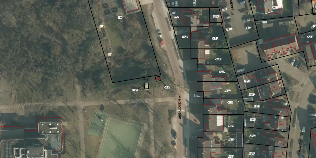 Meidoornlaan 2-TRAF is gelegen op kadastraal perceel MDE01S4496. Deze kadastrale aanduiding is uniek en wordt gebruikt door het Kadaster om eigendomsrechten en andere zakelijke rechten vast te leggen. Het perceel maakt onderdeel uit van de kadastrale gemeente Made en Drimmelen.