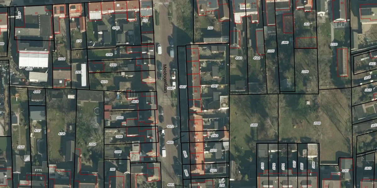 Het perceel waarop Meidoornlaan 39 staat heeft een oppervlakte van 1015 m². Dit is een zeer groot perceel. De perceeloppervlakte wordt geregistreerd door het Kadaster. Gedetailleerde informatie over de maten van dit perceel kunt u vinden in het rapport Kadastrale kaart met maatvoering van Meidoornlaan 39.