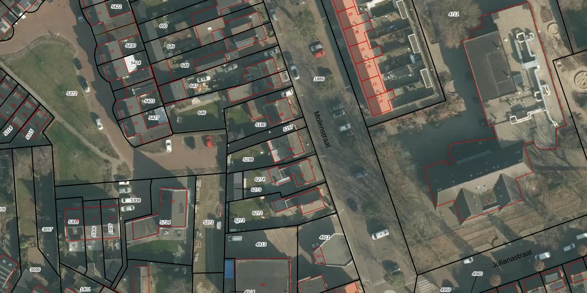 Molenstraat 13-A is gelegen op kadastraal perceel MDE01S5198. Deze kadastrale aanduiding is uniek en wordt gebruikt door het Kadaster om eigendomsrechten en andere zakelijke rechten vast te leggen. Het perceel maakt onderdeel uit van de kadastrale gemeente Made en Drimmelen.