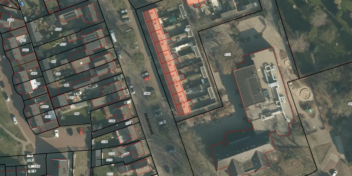 Het perceel waarop Molenstraat 14 staat heeft een oppervlakte van 2900 m². Dit is een zeer groot perceel. De perceeloppervlakte wordt geregistreerd door het Kadaster. Gedetailleerde informatie over de maten van dit perceel kunt u vinden in het rapport Kadastrale kaart met maatvoering van Molenstraat 14.