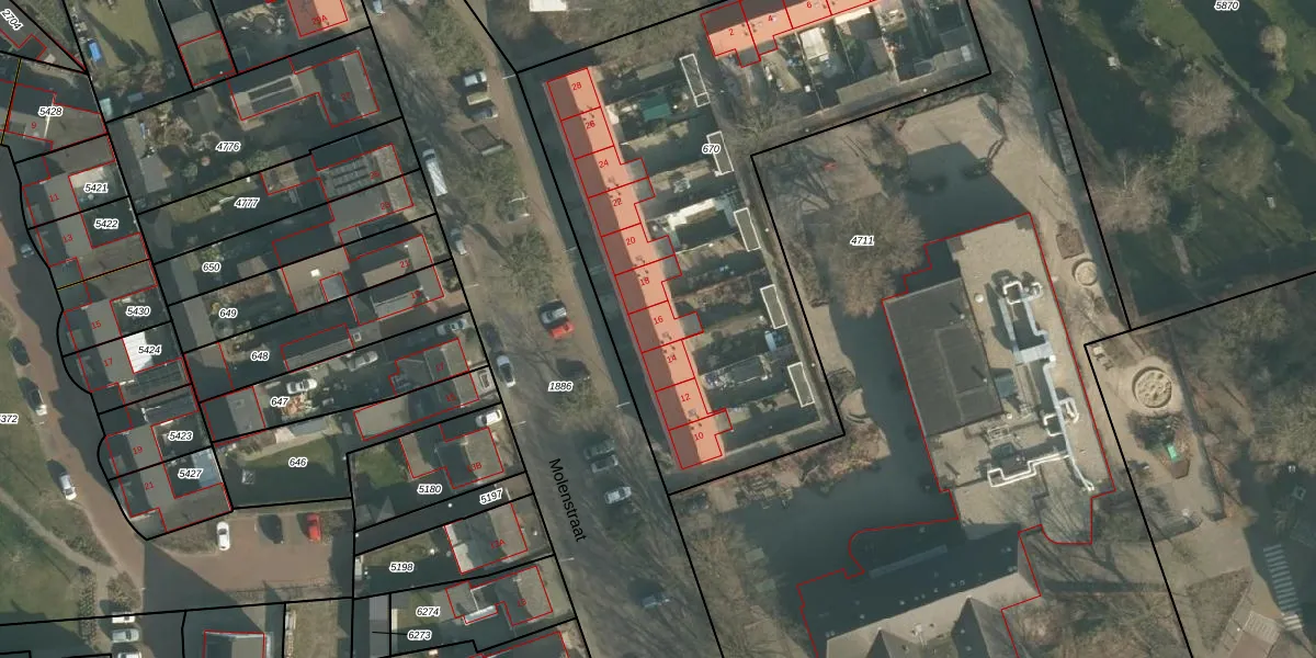 Het perceel waarop Molenstraat 16 staat heeft een oppervlakte van 2900 m². Dit is een zeer groot perceel. De perceeloppervlakte wordt geregistreerd door het Kadaster. Gedetailleerde informatie over de maten van dit perceel kunt u vinden in het rapport Kadastrale kaart met maatvoering van Molenstraat 16.