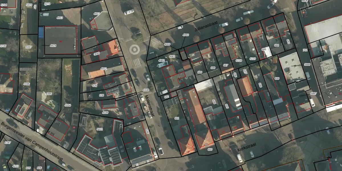 Molenstraat 2 is gelegen op kadastraal perceel MDE01S4962. Deze kadastrale aanduiding is uniek en wordt gebruikt door het Kadaster om eigendomsrechten en andere zakelijke rechten vast te leggen. Het perceel maakt onderdeel uit van de kadastrale gemeente Made en Drimmelen.