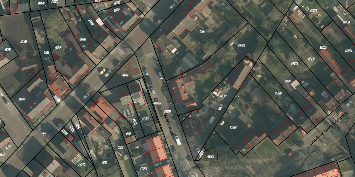 Het perceel waarop Molenstraat 34 staat heeft een oppervlakte van 1040 m². Dit is een zeer groot perceel. De perceeloppervlakte wordt geregistreerd door het Kadaster. Gedetailleerde informatie over de maten van dit perceel kunt u vinden in het rapport Kadastrale kaart met maatvoering van Molenstraat 34.