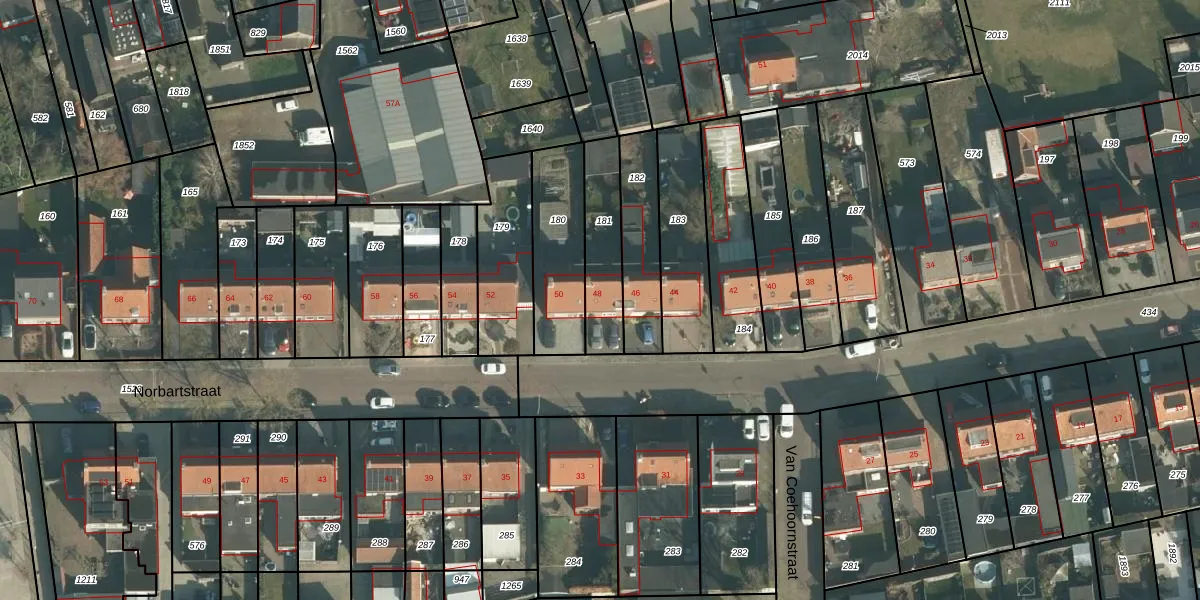 Het perceel waarop Norbartstraat 48 staat heeft een oppervlakte van 223 m². Dit is een middelgroot perceel. De perceeloppervlakte wordt geregistreerd door het Kadaster. Gedetailleerde informatie over de maten van dit perceel kunt u vinden in het rapport Kadastrale kaart met maatvoering van Norbartstraat 48.