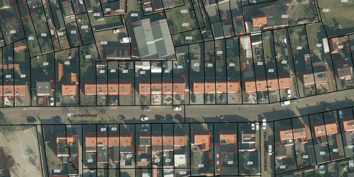 Het perceel waarop Norbartstraat 52 staat heeft een oppervlakte van 303 m². Dit is een groot perceel. De perceeloppervlakte wordt geregistreerd door het Kadaster. Gedetailleerde informatie over de maten van dit perceel kunt u vinden in het rapport Kadastrale kaart met maatvoering van Norbartstraat 52.